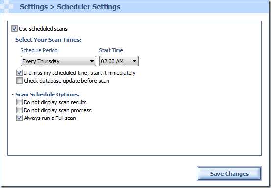 Planowanie skanów jest możliwe dzięki Spyware Terminator. Po prostu wybierz dzień i godzinę opcji skanowania i zapisz. Chociaż opcja szybkiego skanowania jest szybkim i łatwym rozwiązaniem, ale skanuje tylko pliki wykonywalne. Zaplanowanie pełnego skanowania zapewni Ci więcej spokoju.