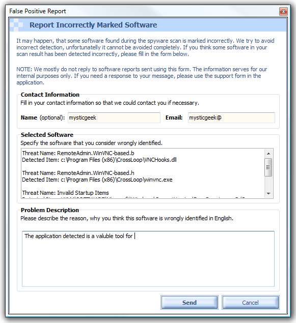 Podczas zgłaszania fałszywego pozytywnego wyniku wykrycia pojawia się inny ekran. Wypełnij dane kontaktowe, jeśli chcesz, i napisz krótki opis, dlaczego wykrycie jest fałszywe, a następnie wyślij je.