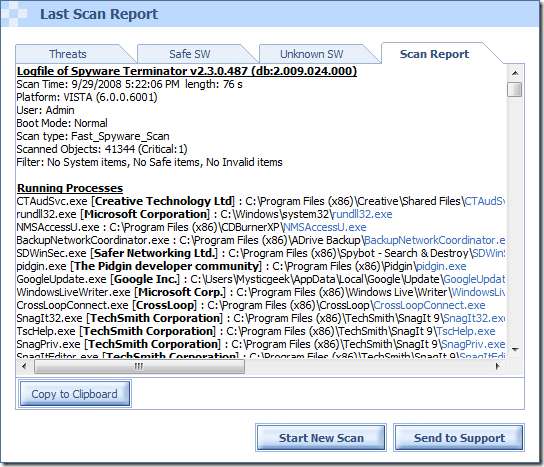 Istnieje przyjemna możliwość śledzenia wszystkich skanów poprzez kopiowanie wyników do schowka i w przeszłości do dokumentacji. Jest to niezwykle przydatne, jeśli komputer otrzymuje wiele wystąpień oprogramowania szpiegującego.