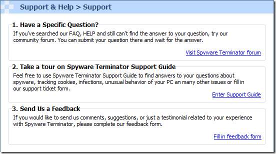 Ostatnią rzeczą, o której należy wspomnieć, jest to, że Spyware Terminator zawiera świetne Centrum pomocy i obsługi technicznej.