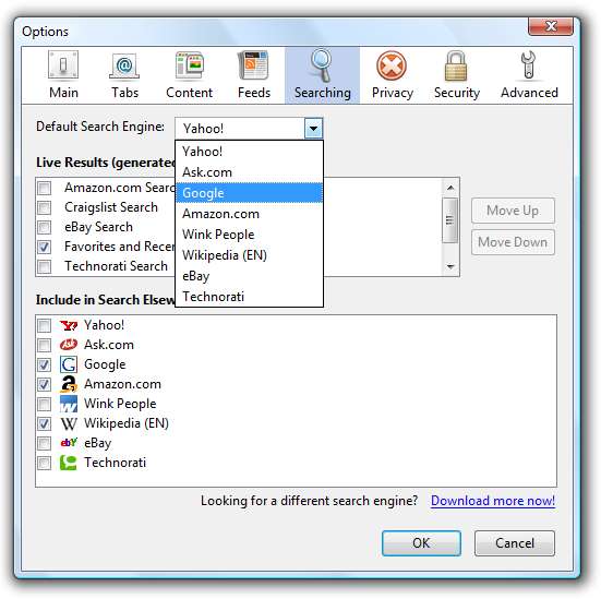 Nie jestem pewien dlaczego, ale byłem trochę zaskoczony, widząc Yahoo jako domyślną opcję na pasku wyszukiwania. Możesz to łatwo zmienić w Opcjach.