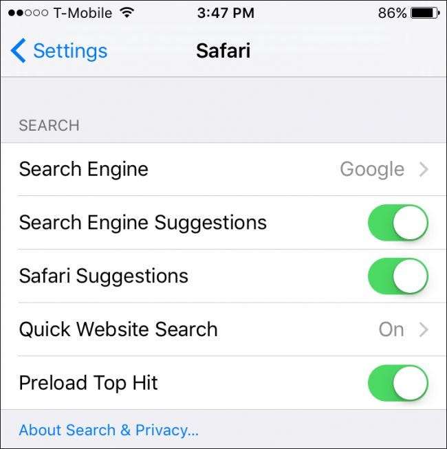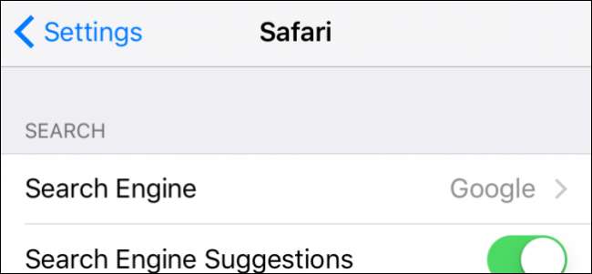 Pierwszą rzeczą, którą musisz zrobić, jest stuknięcie, aby otworzyć Ustawienia na swoim iPhonie lub iPadzie, a następnie stuknięcie w „Safari”. Najwyższym ustawieniem Safari, które zobaczysz, są ustawienia wyszukiwania.