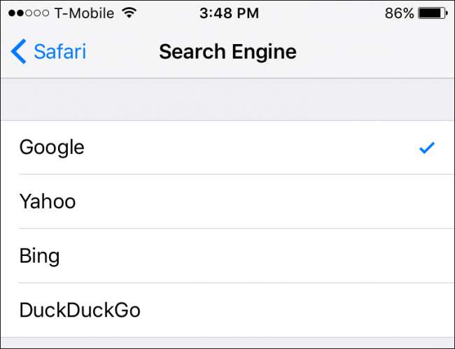 U góry znajduje się ustawienie „Wyszukiwarka”. Domyślnie jest ustawiony na korzystanie z Google, ale możesz go zmienić na Yahoo, Bing lub DuckDuckGo.
