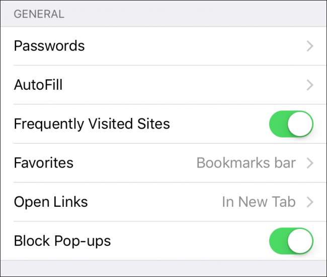 Przeglądając dalej opcje Ogólne, możesz zdecydować, czy chcesz często odwiedzane witryny pojawi się na stronie nowej karty.