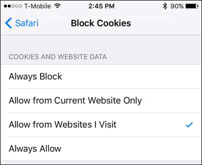 W opcjach „Blokuj pliki cookie” możesz zdecydować, jak restrykcyjne są Twoje zasady dotyczące plików cookie. Domyślnie jest ustawione na „Zezwalaj na odwiedzane przeze mnie strony internetowe”, co jest prawdopodobnie najwyższą wartością, z której chcesz skorzystać, jeśli chcesz zachować większość funkcji podczas surfowania po Internecie.