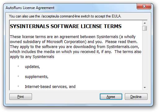 Przy pierwszym uruchomieniu Autoruns na komputerze pojawia się umowa licencyjna: