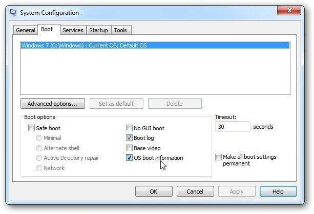 Jeśli wybierzesz opcję „Informacje o rozruchu systemu operacyjnego”, zobaczysz każdy sterownik podczas ładowania. Może to być pomocne, aby zobaczyć, co długo się ładuje.