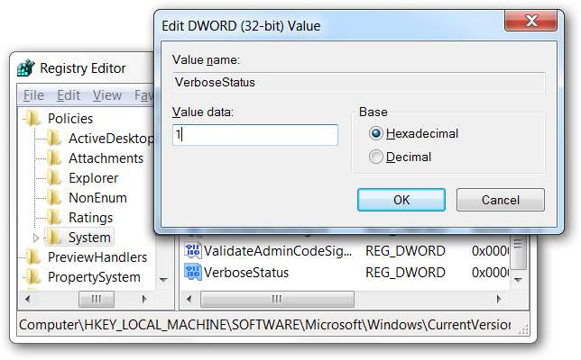 Gdy już tam będziesz, utwórz nowy 32-bitowy DWORD po prawej stronie o nazwie VerboseStatus, nadając mu wartość 1.
