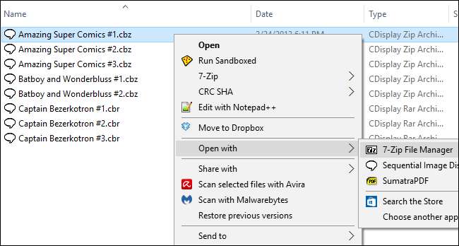 Ponieważ archiwa komiksów są po prostu zmieniane na nazwy typów plików archiwów, możesz użyć dowolnego narzędzia do archiwizacji, które może obsługiwać podstawowy format, aby nimi manipulować. Oznacza to, że możesz pobrać plik komiksu - powiedzmy Amazing Super Comics # 1.cbz - kliknij go prawym przyciskiem myszy, wybierz Otwórz za pomocą i otwórz go w dowolnej aplikacji obsługującej pliki .ZIP.