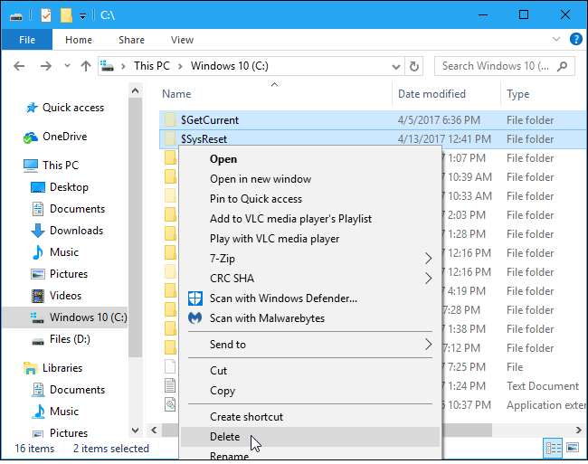 Aby pozbyć się tych folderów, możesz po prostu usunąć je w staroświecki sposób. Wybierz foldery w Eksploratorze plików, kliknij je prawym przyciskiem myszy i wybierz „Usuń”. Eksplorator plików wyświetli monit o udzielenie administratorowi uprawnień do ich usunięcia, a następnie możesz opróżnić Kosz, aby zwolnić miejsce, które zajmują na urządzeniu.