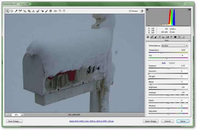 Dzięki dość prostej edycji, wybraniu odpowiedniego balansu bieli i podstawowych korektach, nasz obraz RAW z aparatu fotograficznego pokazuje teksturę w odcieniach bieli i szarości śniegu, a także szereg kolorów i różne tekstury w odcieniach szarości skrzynki pocztowej. Ponieważ działa to w większej przestrzeni kolorów, pliki RAW mają nadmiar informacji i wyrzucają to, czego nie potrzebują, na podstawie decyzji, które podejmujesz. Możesz myśleć o tym jako o przerysowaniu obrazu na podstawie podjętych decyzji, używając oryginalnej migawki jako punktu wyjścia.