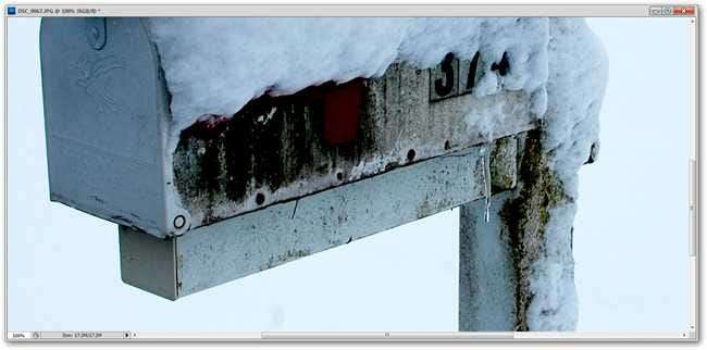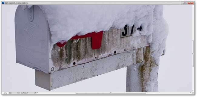 Wyolbrzymienie poziomów obrazu JPG może dać wrażenie zwiększonej szczegółowości w niektórych obszarach, chociaż odrzuca informacje o kolorach, których możesz nie chcieć utracić. Zwróć uwagę, jak brud i plamy na skrzynce pocztowej tracą szczegóły, gdy wydobywają się szczegóły ze śniegu. Prawdą jest, że fotograf może chcieć tego szorstkiego, ciemnego wyglądu - ale odrzucenie szczegółów często może być bardzo problematyczne.