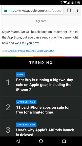 Jednak na stronie Google AMP reklamy są znacznie bardziej stonowane - to tylko kilka małych banerów, bez dodatkowych śmieci na końcu - tylko koniec rzeczywistej strony, pokazujący oficjalną listę trendów w witrynie. Czy nie jest lepiej?