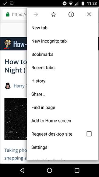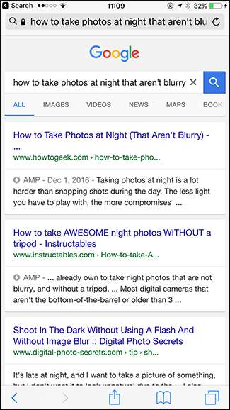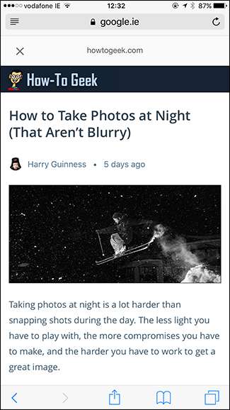 Ponadto po kliknięciu pasek adresu URL będzie zawierał adres Google zamiast adresu oryginalnej witryny internetowej. Na ekranie zobaczysz pasek z oryginalnym adresem URL. Dotknięcie X przenosi Cię z powrotem do wyszukiwarki Google. Poniżej obraz po lewej stronie to wersja AMP naszego artykułu o fotografii nocnej, a obraz po prawej to oryginalna wersja mobilna z howtogeek.com.