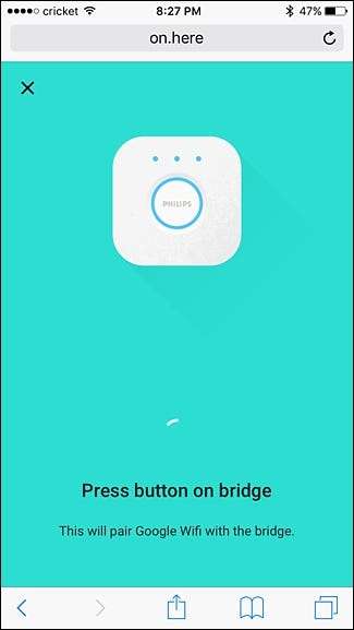 Aby to skonfigurować, nie zrobisz tego w aplikacji Google Wi-Fi, ale w przeglądarce internetowej. Otwórz więc wybraną przeglądarkę internetową i przejdź do On.Here . Tam przejdziesz do ekranu, który pozwoli ci sparować mostek Philips Hue. Stuknij w „Paruj” w prawym dolnym rogu.