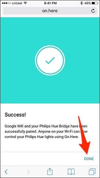 Daj mu chwilę, a most Hue Bridge pomyślnie sparuje się z Twoją siecią Wi-Fi Google. Kliknij „Gotowe” w prawym dolnym rogu ekranu.