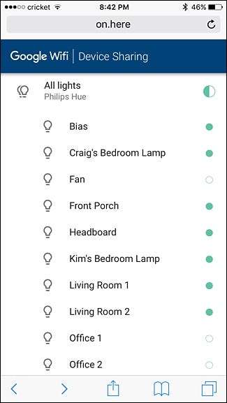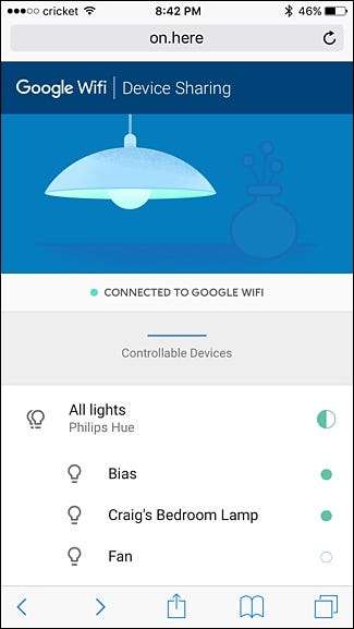 Każdy, kto jest połączony z Twoją siecią Wi-Fi Google ( nawet goście ) można wpisać „ On.Here ”Do wybranej przeglądarki internetowej (na telefonie, tablecie lub komputerze) i natychmiast kontroluj urządzenia smarthome. Niestety, obecnie obsługiwane są tylko światła Philips Hue, a funkcje nie są niesamowite ani nic, ale jest to przynajmniej szybki i łatwy sposób sterowania oświetleniem przez innych domowników. Miejmy nadzieję, że inne urządzenia zostaną wkrótce dodane przez Google.
