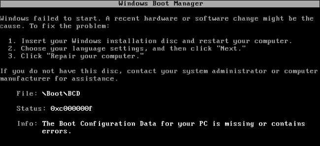 Dla porównania, oto dlaczego nie należy po prostu usuwać partycji Zastrzeżone przez system. My użył edytora partycji GParted na Live CD Ubuntu aby usunąć partycję Zastrzeżone przez system, a następnie ustawić główną partycję systemową Windows jako startową bez próby kopiowania plików startowych. Zobaczyliśmy komunikat informujący, że brakuje naszych danych konfiguracji rozruchu i że musimy to zrobić napraw komputer za pomocą nośnika instalacyjnego systemu Windows .