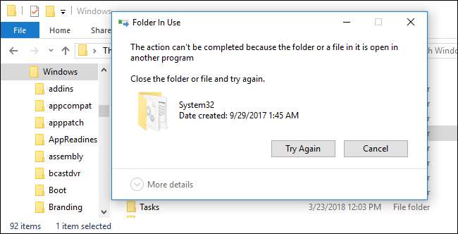 Następnie ponownie spróbowaliśmy usunąć folder, ale system Windows powiedział, że nie możemy go usunąć, ponieważ pliki w folderze System32 były otwarte w innym programie.
