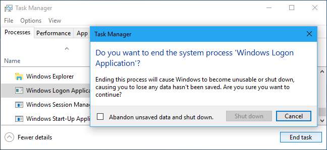Jeśli spróbujesz zakończyć proces w Menedżerze zadań, zobaczysz komunikat, że zakończenie procesu „spowoduje, że system Windows stanie się bezużyteczny lub zostanie zamknięty”. Jeśli pominiesz ten komunikat, ekran stanie się czarny, a komputer nie zareaguje nawet na Ctrl + Alt + Delete. Proces winlogon.exe jest odpowiedzialny za obsługę klawiszy Ctrl + Alt + Delete, więc po zatrzymaniu sesji nie można odzyskać. Aby kontynuować, musisz ponownie uruchomić komputer.