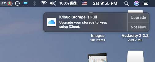Oto problem: ta przestrzeń dyskowa jest współdzielona z resztą iCloud i innymi Twoimi urządzeniami Apple - takimi jak iPhone'y i iPady - i otrzymujesz marne 5 GB w ramach bezpłatnego abonamentu. Jeśli masz dużo zdjęć, Twój dysk iCloud może już być pełny. Jeśli widzisz komunikat „Poza miejscem” na ikonach, prawdopodobnie zauważyłeś również powiadomienia podobne do pokazanego poniżej, wysyłane do Ciebie co kilka godzin.