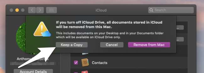 Możesz wyłączyć iCloud Drive w ustawieniach iCloud w Preferencjach systemowych. Wydawałoby się, że wystarczy kliknąć pole wyboru obok „iCloud Drive”, ale jest spory haczyk. Domyślnie Apple usunie wiele plików przechowywanych w iCloud z twojego Maca i staną się one dostępne tylko wtedy, gdy włączysz je ponownie. Będziesz chciał pamiętaj, aby kliknąć „Zachowaj kopię” zamiast po prostu kliknąć przycisk „Usuń z komputera Mac”.
