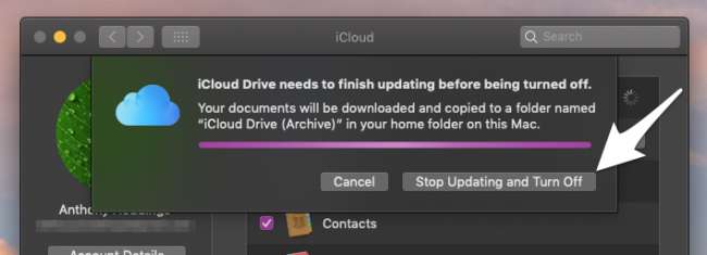 To następne okno próbuje przesłać pozostałe pliki do iCloud, ale ponieważ może to zająć całe wieki, najlepiej po prostu kliknąć „Zatrzymaj aktualizację i wyłącz”.