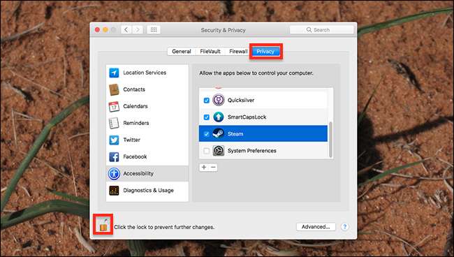 Proces włączania ustawień ułatwień dostępu jest nieco zawiły. Musisz otworzyć Preferencje systemowe, a następnie przejść do Bezpieczeństwo i prywatność> Prywatność> Dostępność. Stamtąd musisz kliknąć ikonę kłódki w lewym dolnym rogu, wprowadzić hasło i dopiero wtedy możesz przyznać dostęp do aplikacji.