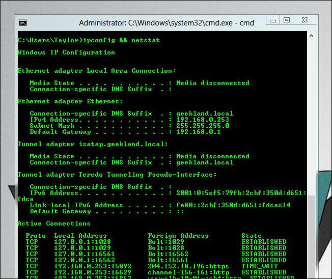 Nosso truque final do dia é aquele que muitos geeks de linha de comando já devem conhecer, a capacidade de executar vários comandos ao mesmo tempo, vinculando-os a "e" comercial duplos. Você pode fazer isso com qualquer comando e vincular quantos quiser: