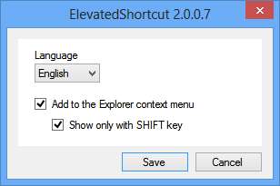 Outra maneira de criar um atalho elevado a partir de um atalho existente é habilitar a entrada do menu de contexto do ElevatedShortcut. Clique no link Configuração na parte inferior da janela do programa e marque ‘Adicionar ao menu de contexto do Explorer’ antes de clicar em OK. Se você quiser evitar que o item de menu apareça o tempo todo, você também deve marcar "Mostrar apenas com a tecla SHIFT" antes de clicar em OK.