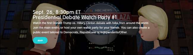 Aparentemente, eles usaram os primeiros debates para refinar sua técnica, e agora você pode desfrutar de uma cobertura completa do debate de realidade virtual - incluindo programação personalizada como a recriação do Rockefeller Plaza de Nova York configurado como uma exposição de história política interativa - contanto que você tenha um fone de ouvido de realidade virtual como o Oculus Rift, HTV Vive, Samsung Gear VR ou outro dispositivo que suporte o Software AltspaceVR .