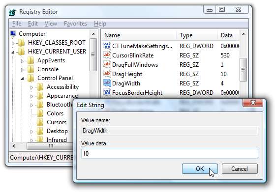Infelizmente, o Tweak UI não funciona no Windows Vista, então você terá que fazer a configuração do registro manualmente ou usar o arquivo de hack do registro para download que forneci, que definirá o tamanho de arrasto para 20 pixels.