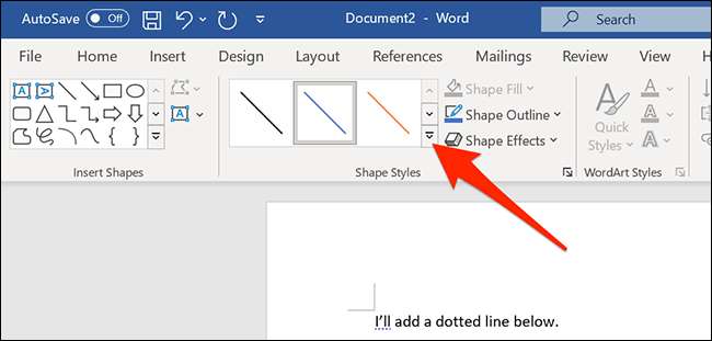 Use o mouse para desenhar uma linha no documento. Pode ser qualquer comprimento que você quiser. Em seguida, verifique se sua nova linha é selecionada (clicando nela uma vez) e selecione "Formato de forma" no menu na parte superior da janela da palavra.