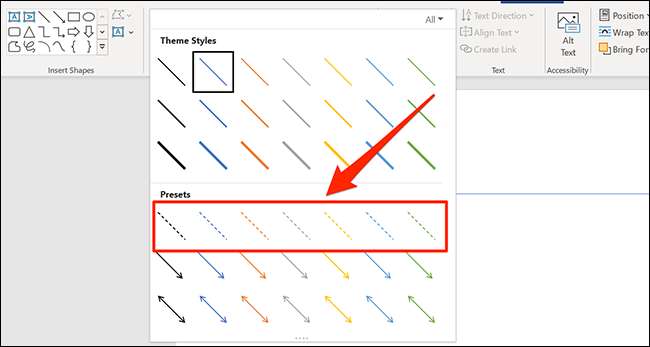 Sob o menu mais, escolha um estilo de linha pontilhada na lista "Predefinições". Depois de clicar nele, o estilo será aplicado à linha que você acabou de desenhar e selecionado no documento.