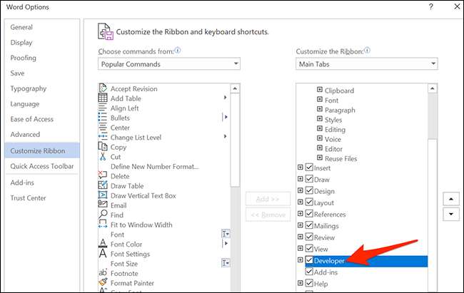 No painel "Personalizar fita" no lado direito da tela, percorra a lista e ative a opção "desenvolvedor".
