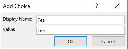 Na janela "Adicionar escolha", digite um novo nome de item no campo "Nome do visor". O campo "Valor" se preenche automaticamente com os dados do primeiro campo, para que você não precise se preocupar com isso.