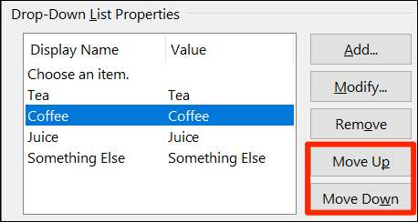 Depois de ter alguns itens adicionados, você pode alterar seu pedido. Para alterar a posição de um item na lista, selecione esse item e, em seguida, clique em "Subir" ou "Mover para baixo" à direita.