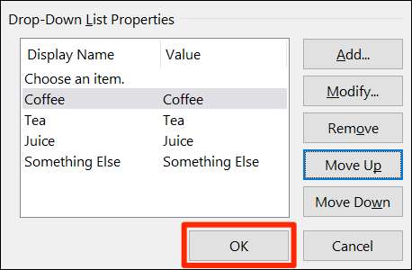 Em seguida, clique em "OK" para adicionar seu item. Repita este processo para cada item que você deseja adicionar à sua lista suspensa.