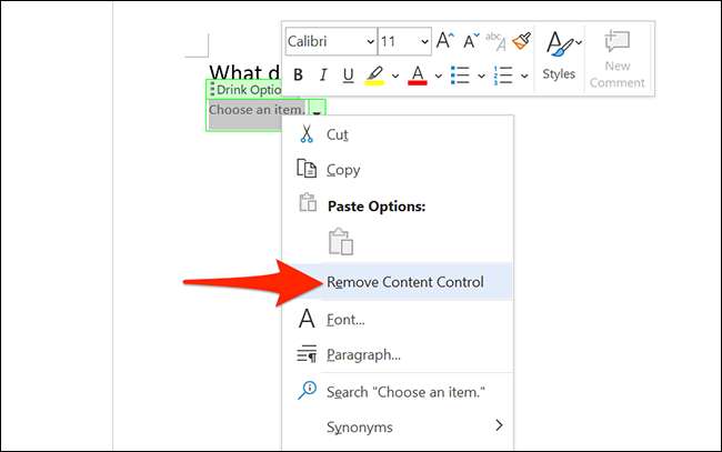 Clique com o botão direito do mouse na lista suspensa no documento e selecione "Remover Controle de Conteúdo". A lista agora será removida.