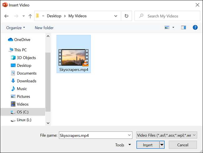 Se você ligar para um vídeo, o PowerPoint somente adiciona uma referência a esse vídeo em sua apresentação. A desvantagem deste método é que você precisa enviar o arquivo de vídeo separadamente se você compartilhar sua apresentação com alguém. Nós escrevemos um guia sobre Como enviar apresentações do PowerPoint com vídeos Então, verifique isso.