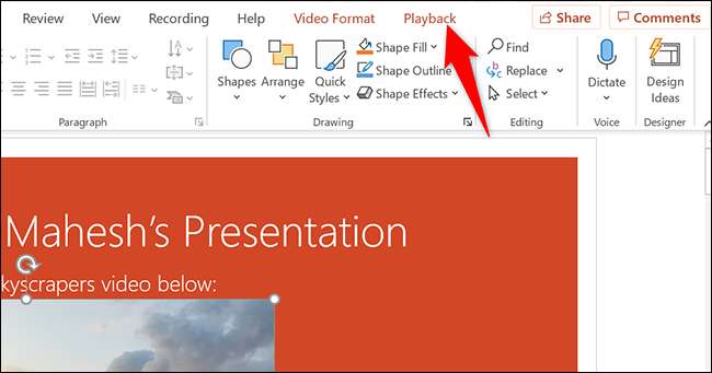 Para acessar essas opções de reprodução, primeiro, clique em seu vídeo na sua apresentação. Em seguida, no topo da janela do PowerPoint, clique em "Reprodução".