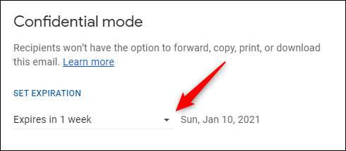 Depois que isso foi clicado, a janela "Modo Confidencial" aparecerá. Na seção "Definir expiração", clique na seta para baixo para exibir uma lista de diferentes tempos de expiração.