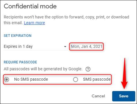A data de validade agora aparecerá à direita da hora selecionada. Além disso, você também pode exigir uma senha. Escolhendo "No SMS Passcode" permitirá que os destinatários abram imediatamente o e-mail, enquanto escolhendo "SMS Passcode" exigirá que o destinatário primeiro insira uma senha que receberá via texto SMS.