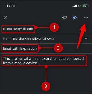 Em seguida, insira (1) O endereço de e-mail do destinatário (2) o assunto do email e (3) o conteúdo do email. Uma vez terminado isso, selecione os três pontos horizontais (três pontos verticais no Android) no canto superior direito da tela.