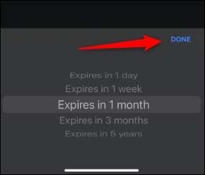 Uma lista de diferentes tempos de expiração aparecerá, variando de um dia a cinco anos. Posicione aquele que você deseja no meio da lista, passando para cima ou para baixo, depois toque em "Concluído".