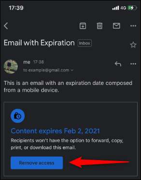 Selecione o email com a data de expiração para abri-lo e na parte inferior do seu email, toque em "Remover Access".
