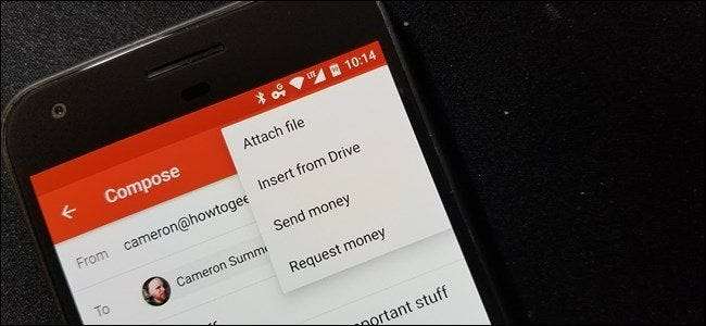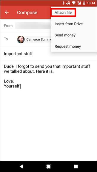 Depois de dizer tudo o que você precisa dizer, toque no pequeno ícone de clipe de papel no canto superior direito. Um novo menu será aberto, oferecendo algumas opções: Anexar um arquivo, Inserir do Drive, Enviar dinheiro e Solicitar dinheiro. Toque na primeira opção.