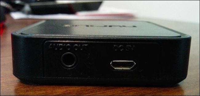 Este receptor é bastante simples, embora não precise realmente ser sofisticado. Um simples LED na frente nos informa quando ele está emparelhado com um dispositivo. Na parte traseira está um conector de alimentação USB de 5 V e uma saída estéreo de 3,5 mm.