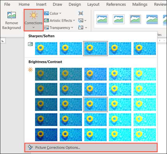 Adicionando borrão a uma imagem na palavra suavizará sua aparência. Selecione a imagem e abra as opções de correções de imagem usando um desses dois métodos.