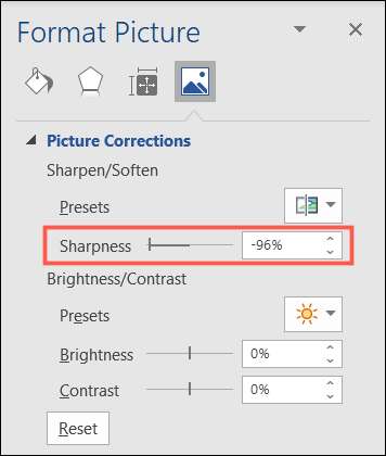 Se necessário, expanda correções de imagem na barra lateral de formato. Em seguida, abaixo da afiação / amolecer, use o controle deslizante de nitidez ou a caixa percentual para diminuir a nitidez.